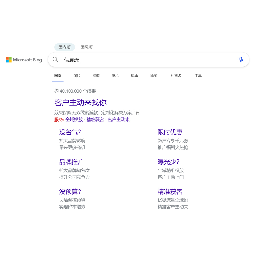 同时集团业务也包含微软bing,天津区域BING独家官方代理商、河南区域独家官方代理商、武汉必应区域代理商、也是字节跳动全生态链综合服务商,为广告主提供整合营销方案以及移动端各类广告资源,同时代理阿里高德本地生活膜务优势媒体及各搜索平台代理商。